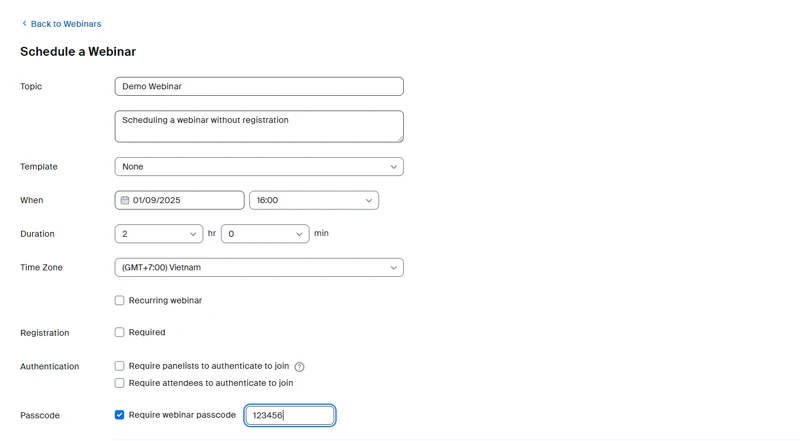 - Require attendees to authenticate to join: Hạn chế quyền truy cập vào hội thảo trên web để chỉ những người dùng đã đăng nhập mới có thể tham gia.
