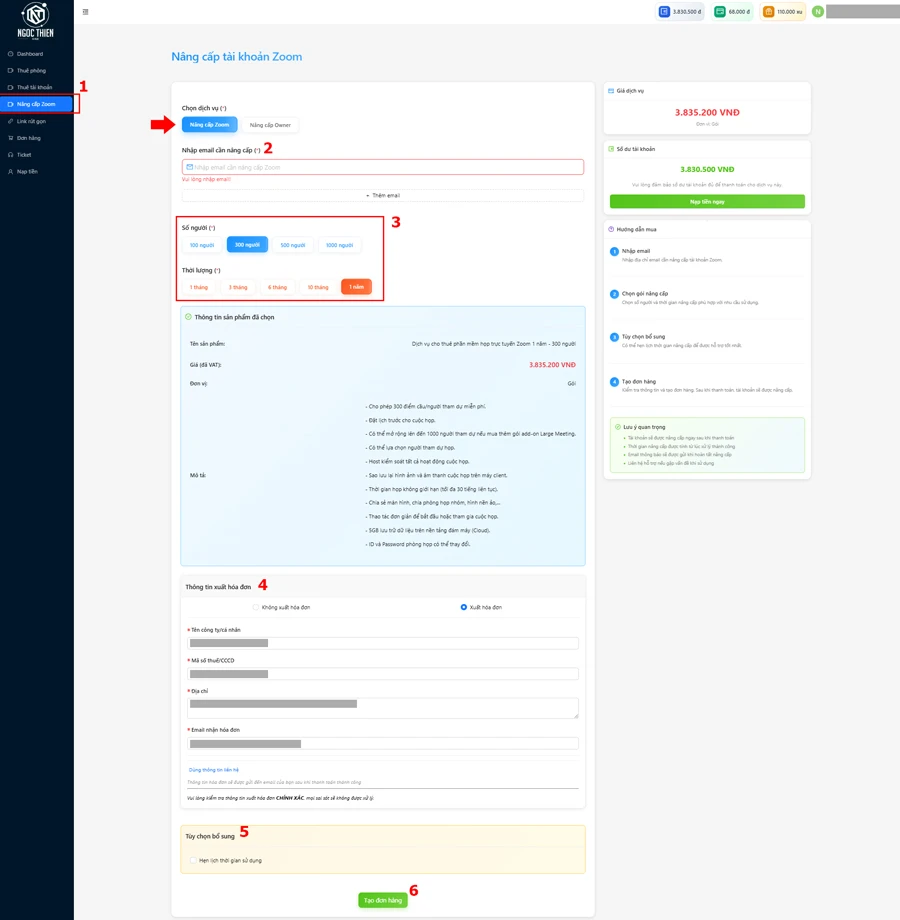 Các bước mua Zoom Pro 300 người tự động tại cs.ngocthien.one
