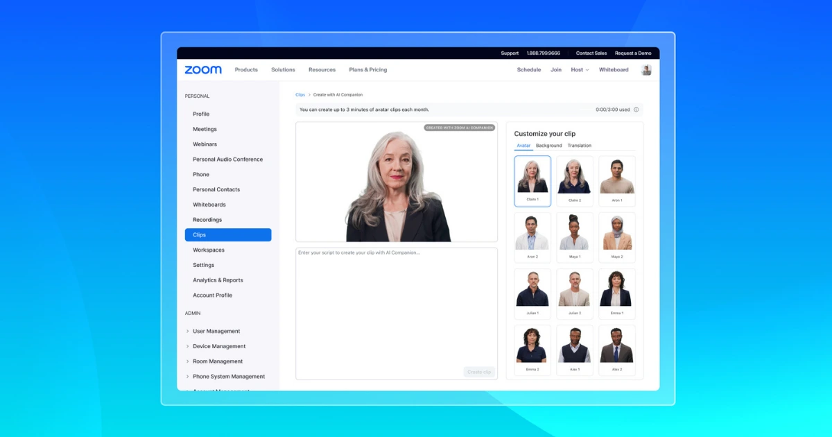 Zoom Clips, công cụ video không đồng bộ và trình ghi màn hình của chúng tôi, hiện cung cấp cho bạn khả năng sử dụng hình đại diện AI trong clip của mình. Bạn có thể tạo hình đại diện tùy chỉnh trông giống và nghe giống bạn hoặc chọn từ thư viện hình đại diện dựng sẵn và thêm tập lệnh của bạn để bắt đầu. Bạn thậm chí có thể yêu cầu Zoom AI Companion tạo tập lệnh cho bạn trong Zoom Docs.