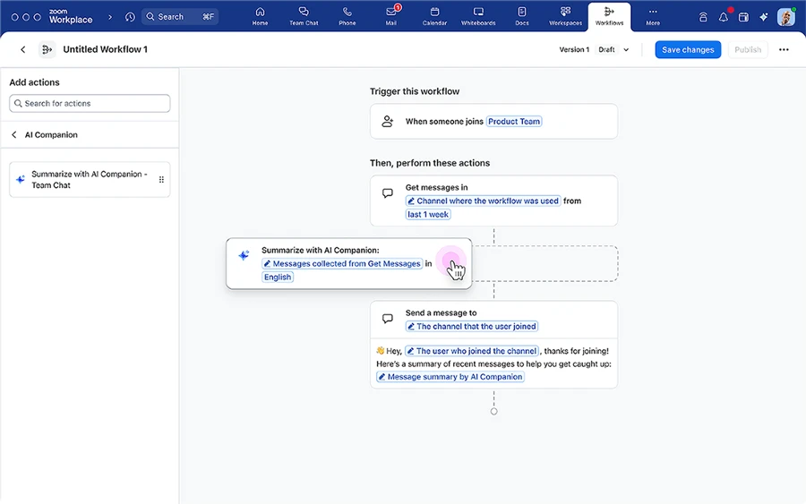 - Tăng năng suất: Giải phóng thời gian cho các hoạt động chiến lược hơn khi nhóm của bạn có thể tự động hóa các tác vụ thường xuyên, như sắp xếp tóm tắt cuộc họp trong một tài liệu và kênh chuyên dụng với sự trợ giúp của AI Companion.