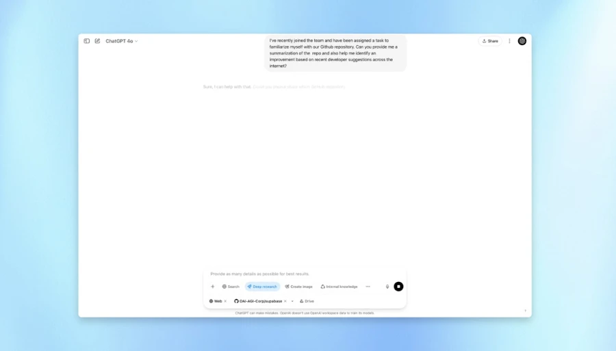 - Công cụ kết nối với các nguồn nội bộ để có câu trả lời cá nhân hóa hơn—kết nối Google Drive, SharePoint, GitHub, Dropbox, v.v.