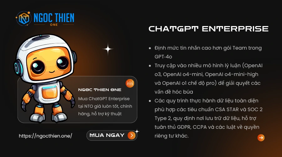 Khác với phiên bản Team, ChatGPT Enterprise được thiết kế dành riêng cho các tổ chức lớn có nhu cầu phức tạp hơn. Phiên bản này tích hợp các tính năng nâng cao, phù hợp cho hoạt động quy mô doanh nghiệp – nơi bảo mật dữ liệu, khả năng mở rộng và hiệu suất mạnh mẽ là yếu tố then chốt. Ngoài ra, Enterprise còn hỗ trợ cửa sổ ngữ cảnh dài hơn, giúp xử lý các chuỗi hội thoại phức tạp hơn.