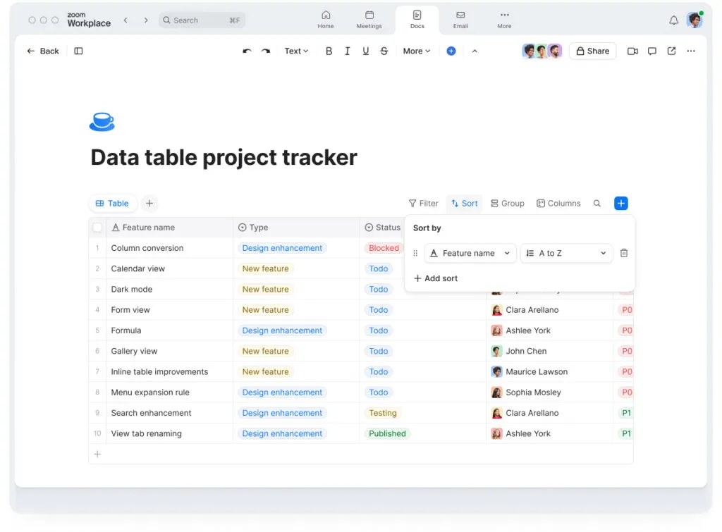 Zoom Docs giúp các nhóm tập hợp lại với nhau trong một tài liệu cộng tác. Sử dụng công cụ này để đặt mục tiêu, lập kế hoạch hàng quý, lập kế hoạch sự kiện, v.v. Duy trì sự ngăn nắp với bộ sưu tập tài liệu liên quan đến một dự án, giúp bạn dễ dàng tìm thấy thông tin và tài sản quan trọng. Bạn cũng có thể theo dõi tình trạng của các mục hành động theo mẫu dự án của chúng tôi hoặc tạo tài liệu theo dõi tùy chỉnh gồm các cột tình trạng mà bạn cần. Bảng dữ liệu cho phép bạn lọc, sắp xếp, nhóm và sắp xếp thông tin dễ dàng.