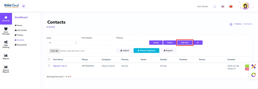 - Bước 3: Nhấp vào Add New để thêm Contacts
