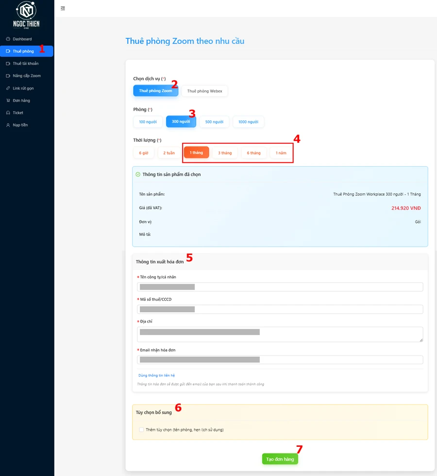 - Chọn dịch vụ Thuê phòng Zoom