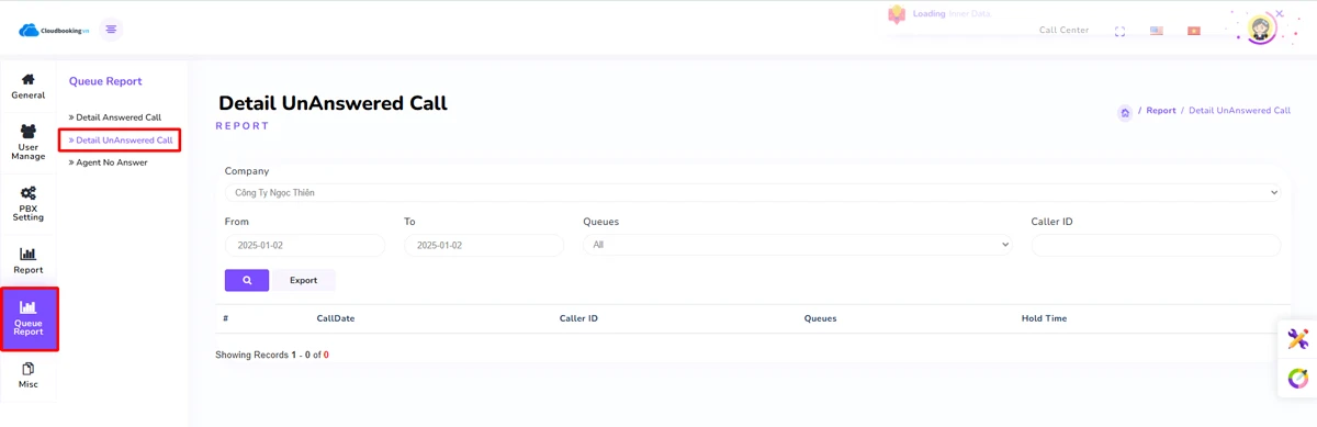 Thống kê cuộc gọi không trả lời của Call Center (Queue)