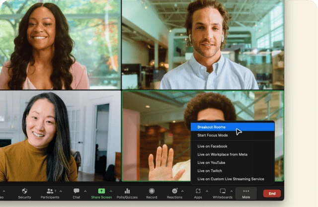 Tính năng phòng theo nhóm trên Zoom, bạn có thể đưa cấu trúc cuộc họp linh động này vào không gian số. Đôi khi bạn cần trò chuyện nhanh với riêng ai đó hoặc tập hợp một nhóm gồm những người được chọn để thảo luận tập trung hơn. Nhu cầu này tồn tại trong cả cuộc họp trực tiếp và trực tuyến, đặc biệt là khi lực lượng lao động ngày nay liên tục chuyển đổi qua lại giữa hai hình thức này.