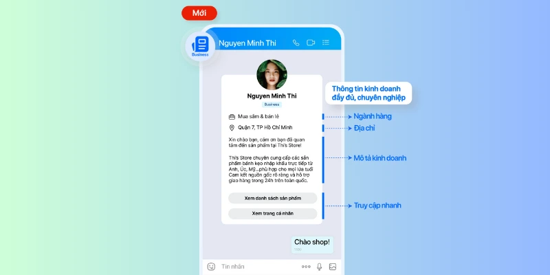 Khách hàng luôn tìm kiếm những địa chỉ uy tín để liên hệ. Nhãn Business đính kèm tên Zalo nổi bật và Trang giới thiệu chuyên nghiệp với đầy đủ các thông tin thiết yếu sẽ giúp bạn nhận được sự tin tưởng của khách hàng ngay từ lần trò chuyện đầu tiên.