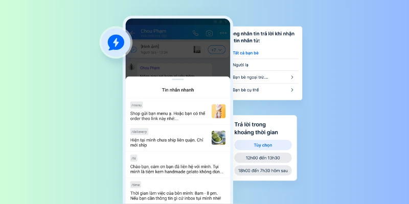 Mua code Zalo Business với tin nhắn tự động, bạn có thể trả lời khách hàng ngay cả khi vắng mặt bằng mẫu tin soạn sẵn. Ngoài ra, bạn còn có thể giảm thời gian soạn tin nhắn (nội dung lặp đi lặp lại) với mẫu tin nhắn nhanh.