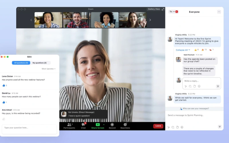 Dịch vụ Zoom Webinars 10000 attendees cung cấp các tính năng như Q&A, chat trực tiếp, thăm dò ý kiến, giúp bạn dễ dàng giao tiếp và tạo sự tương tác giữa diễn giả và người tham gia, từ đó gia tăng mức độ tham gia và sự hài lòng của người tham dự.
