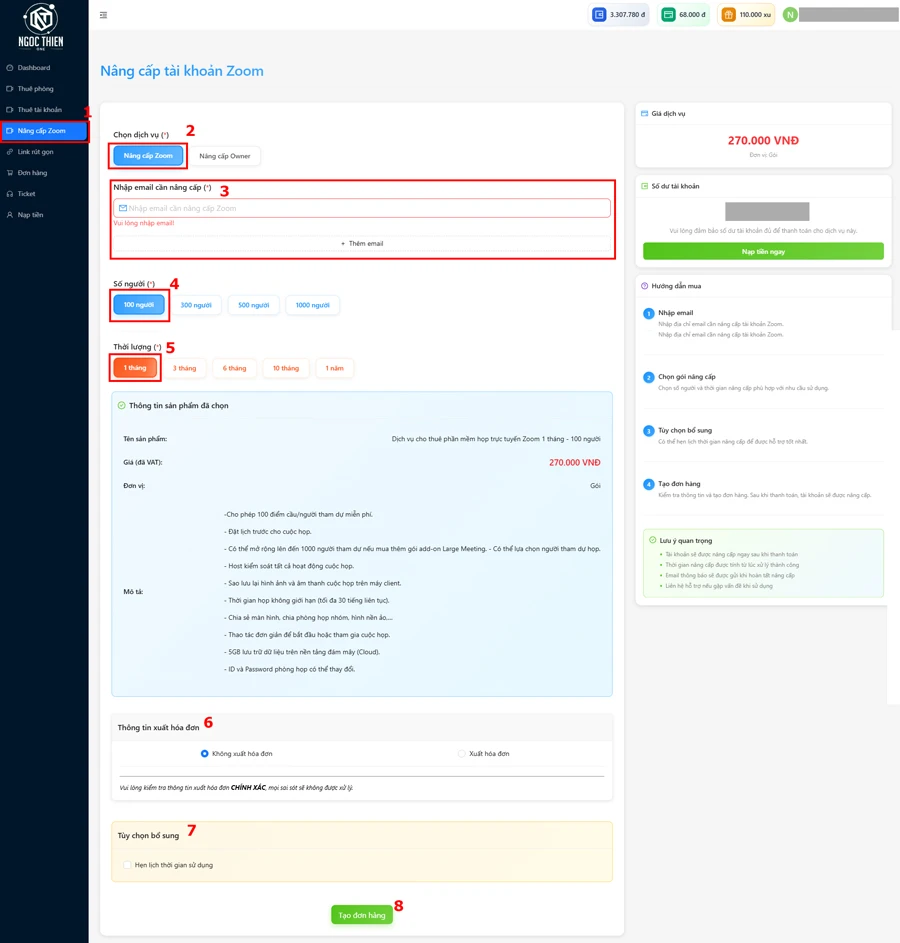 Nếu muốn Zoom được nâng cấp vào thời điểm cụ thể, bạn có thể chọn lịch nâng cấp tự động để được hệ thống xử lý đúng thời gian mong muốn. - Cuối cùng, hãy nhấn “Tạo đơn hàng” để hoàn tất bước này.