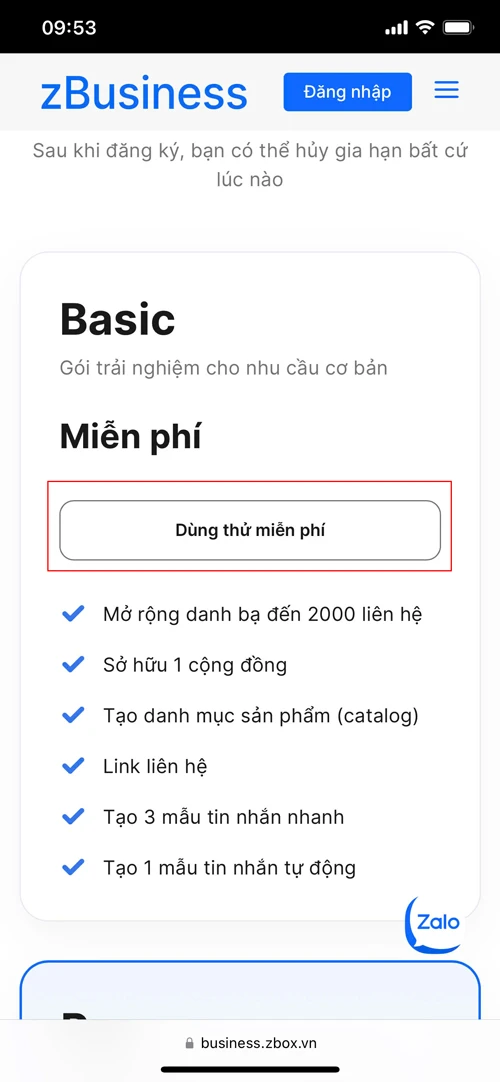 Cách đăng ký Zalo Business Basic