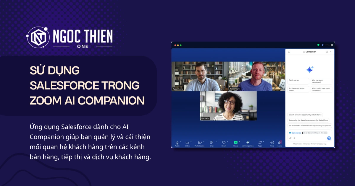 Sử dụng ứng dụng Salesforce trong Zoom AI Companion giúp bạn quản lý và cải thiện mối quan hệ khách hàng trong các hoạt động bán hàng, marketing và chăm sóc khách hàng. Bạn có thể quản lý khách hàng tiềm năng (lead), theo dõi cơ hội (opportunity), tự động hóa tác vụ và truy cập thông tin tài khoản trực tiếp ngay trong AI Companion mà không cần chuyển đổi giữa các ứng dụng.