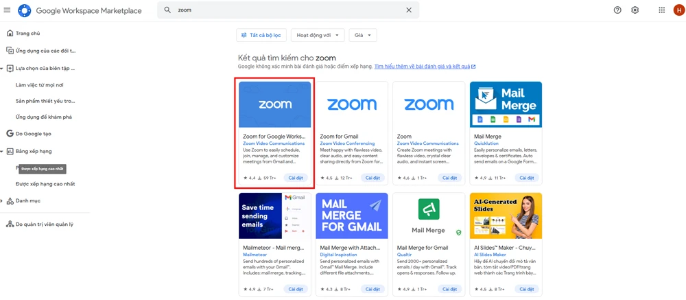 - Tìm đến Google Workspace Marketplace và tìm kiếm Zoom.