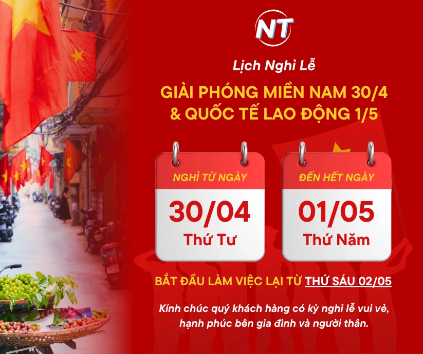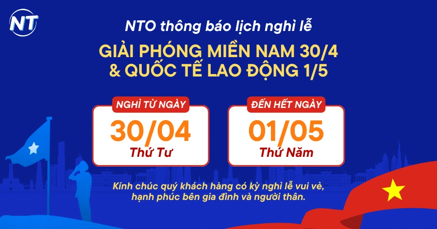 Nhân dịp kỷ niệm 50 năm Ngày Giải phóng miền Nam (30/04/1975 – 30/04/2025) và Ngày Quốc tế Lao động 01/05, NTO xin thông báo đến Quý khách hàng và Quý đối tác lịch nghỉ lễ 30/4 & 1/5/2025 như sau: