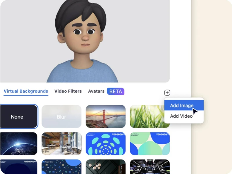 Tìm hình nền bạn thích và lưu vào thiết bị của mình. Sau đó, chuyển đến phần cài đặt Zoom, chọn “Hình nền và hiệu ứng”, nhấp vào dấu + trong thẻ nền ảo để thêm hình ảnh. Bạn thậm chí có thể thêm tệp video để có nền động!