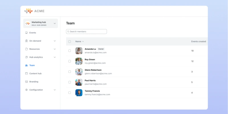 Tạo trung tâm nhóm để quản lý mọi thứ ở một nơi – thiết lập sự kiện, điều phối diễn giả, bản ghi và số liệu phân tích. Không còn tình trạng tắc nghẽn do chỉ có một quản trị viên đơn lẻ hoặc nội dung phân tán.