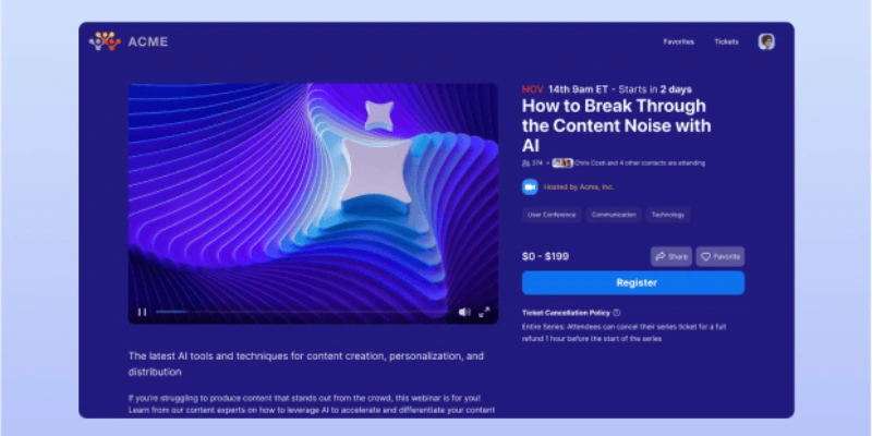 Tận dụng mọi điểm tiếp xúc, từ trang đăng ký ấn tượng đến không gian sự kiện sống động với phòng đợi tùy chỉnh và các cuộc thảo luận tương tác. Giữ chân họ bằng một trung tâm nội dung phong phú, biến người xem một lần thành người theo dõi trung thành.