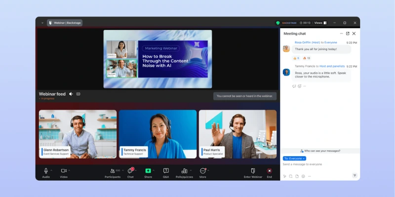Dù bạn đang chủ trì sự kiện cho 100 hay 100.000 người dự thính, hãy mang đến trải nghiệm chất lượng cao đồng nhất với video 1080p cực kỳ sắc nét, hiệu suất đáng tin cậy và các công cụ tương tác mạnh mẽ hoạt động ở mọi quy mô.